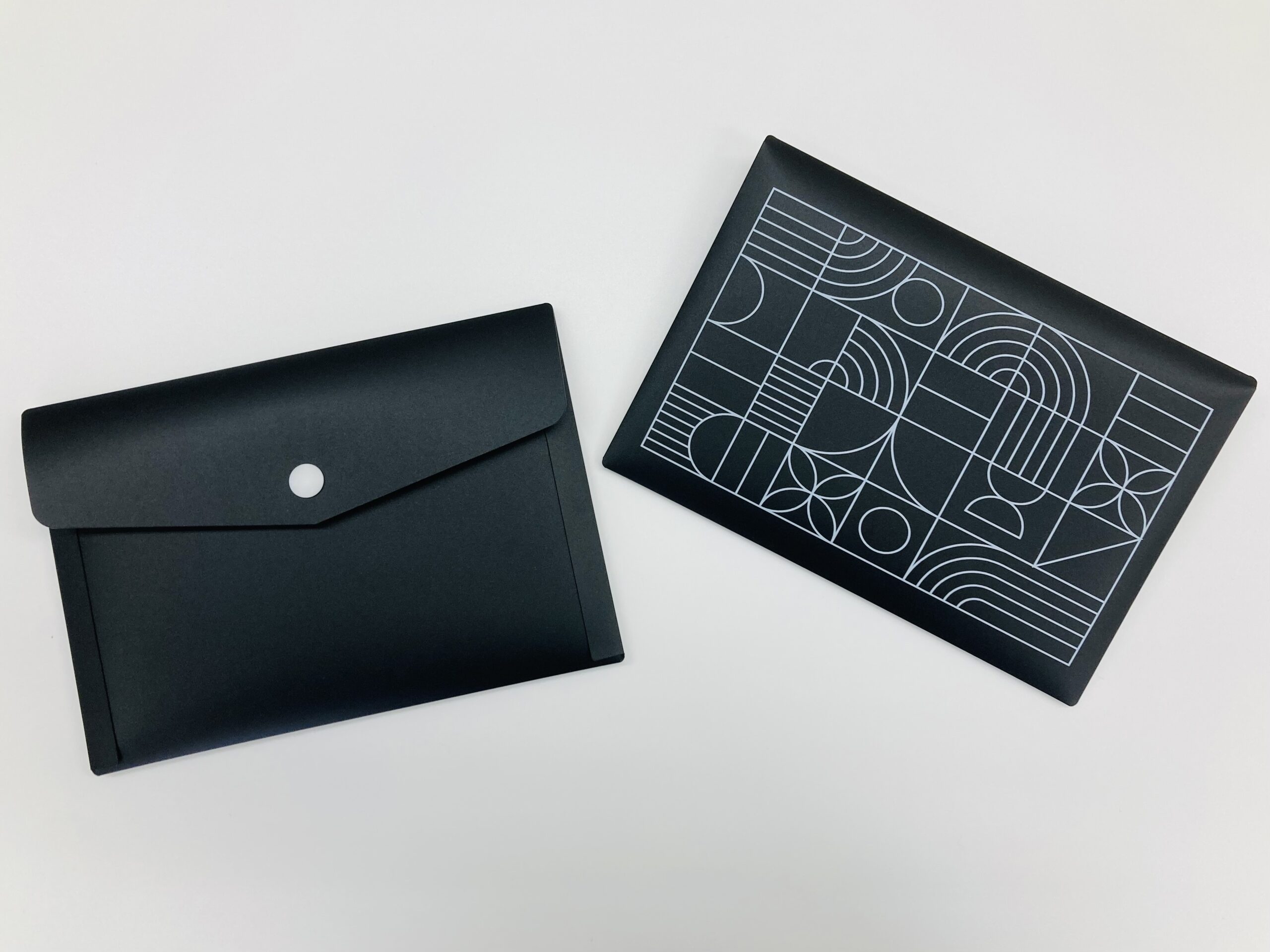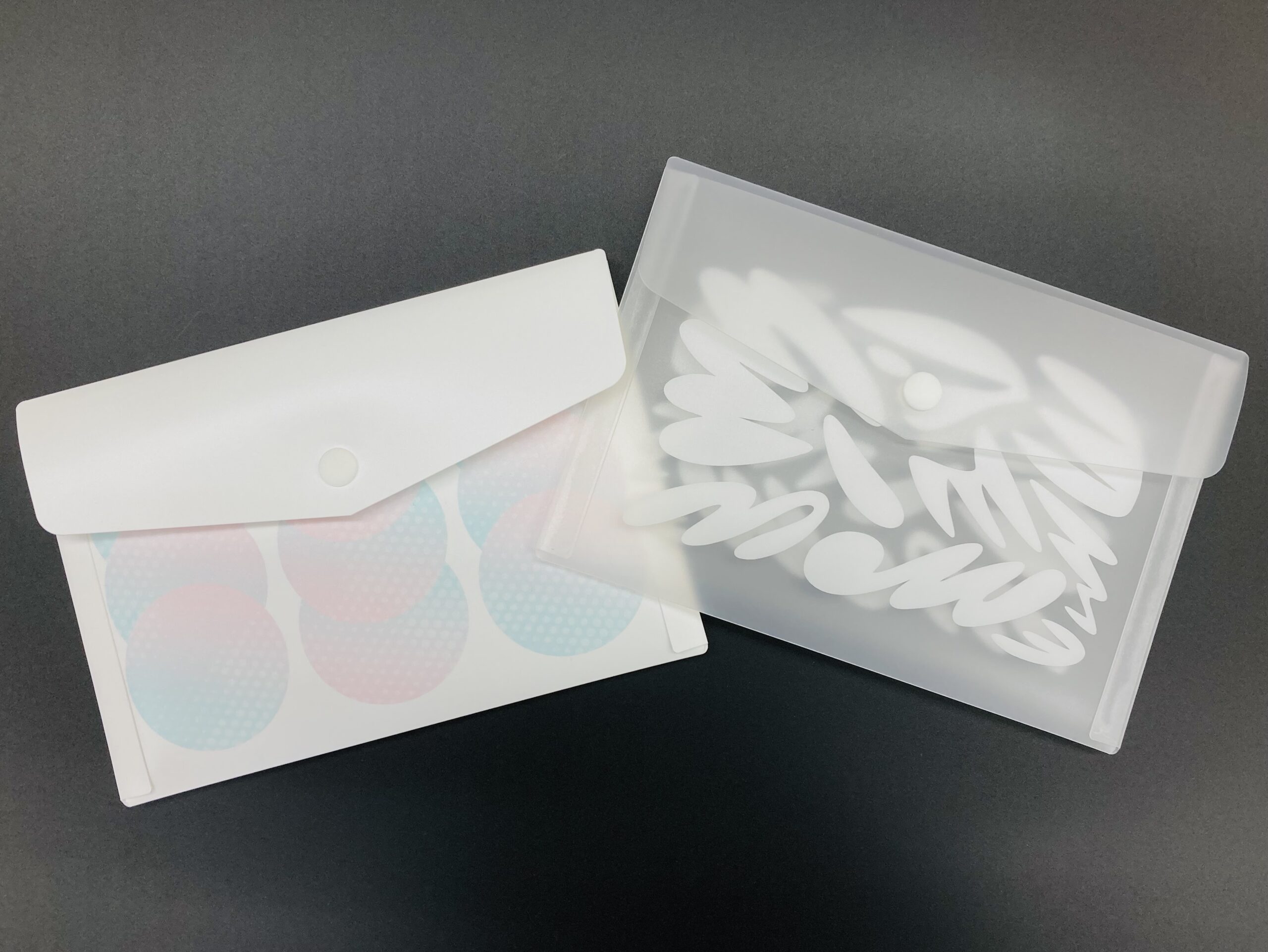 形状と素材:封筒のようなフラットな形状で、PVC(ポリ塩化ビニル)やPP(ポリプロピレン)といった、透明感や耐久性のある素材で作られています。