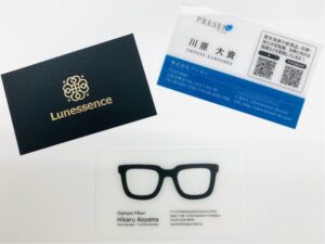 透明なPET素材に印刷を施した名刺です。透明感を活かしたデザインや、白インクを併用して透明部分と印刷部分のコントラストを出すことで、クリエイティブでインパクトのある印象を与えられます。紙の名刺とは異なる独特な質感と、光の当たり方で印象が変わる面白さがあり、記憶に残りやすいという特徴があります。また弊社では素材から質感にこだわったPP梨地やPPスーパーラインの素材も取り揃えております。印刷や箔押しを施すことで、よりシックで高級感のある商品に見せることもできます。素材の厚みも自由にお選びいただけますが、価格や納期からお勧めの厚みは0.4mm厚になります。長方形の規格型の形状はもちろん、もっとオリジナリティがほしい場合には別注品で形状変更も可能です。イラストの形にそって切り抜いて、折り曲げる罫線を入れたりするとクリアスタンドに変身したり発想次第で無限に作れる商品です。デザイン設計の知識がなくても弊社で作成できるので問題ございません。また弊社では簡易試作で実物サンプル確認もできるので安心してご利用いただけます。※別注形状は別途木型代が発生いたします。